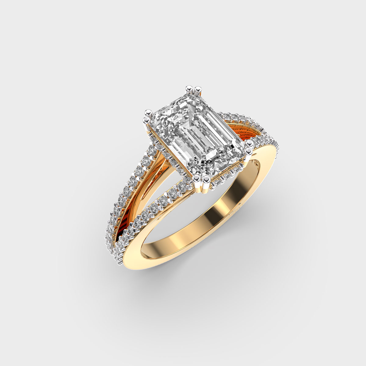 Sleek and contemporary, Emerald Cut Diamond in Duo Branching Band showcases an emerald-cut diamond at its heart, set within a duo branching band that adds a modern twist. The branching design elegantly frames the central stone, creating a dynamic interplay of light and structure. Perfect for those who appreciate architectural elegance with a touch of sparkle, this ring complements both traditional attire and modern ensembles, making it a versatile statement piece for any occasion.