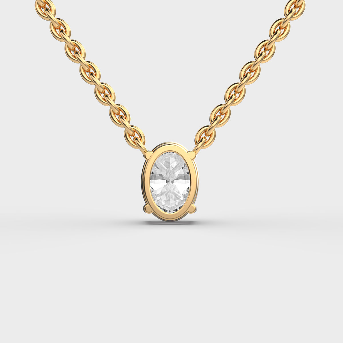 Radiating timeless elegance, the Esra Classic Oval Solitaire Diamond Pendant (With Chain) features a stunning oval-cut diamond that captures light beautifully from every angle. Suspended from a delicate chain, its refined design highlights the diamond’s natural brilliance, making it a versatile piece perfect for daily wear or special occasions.
