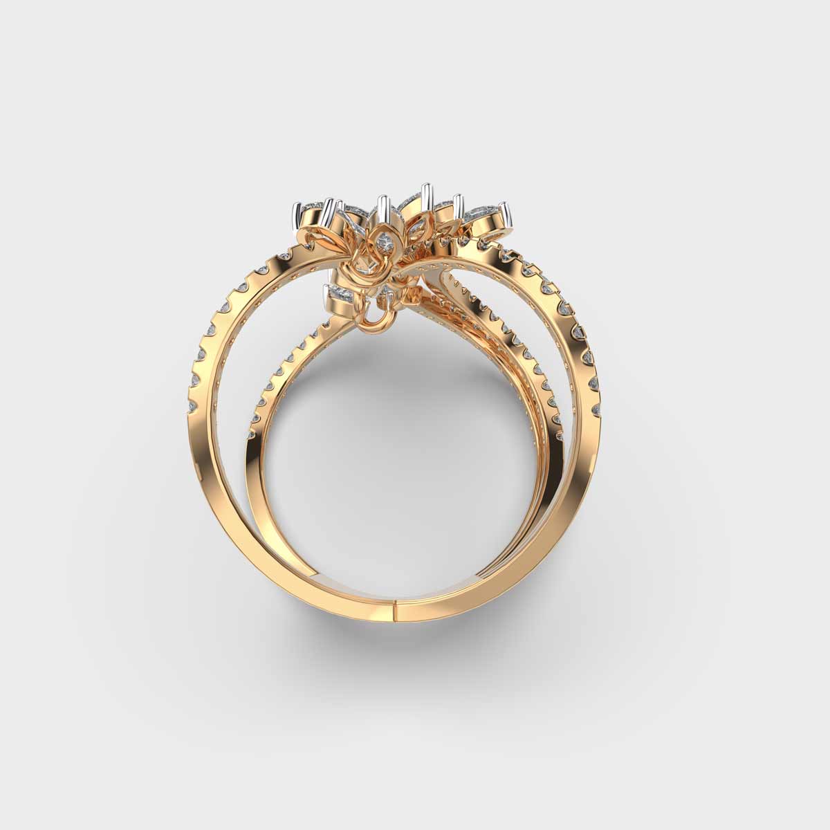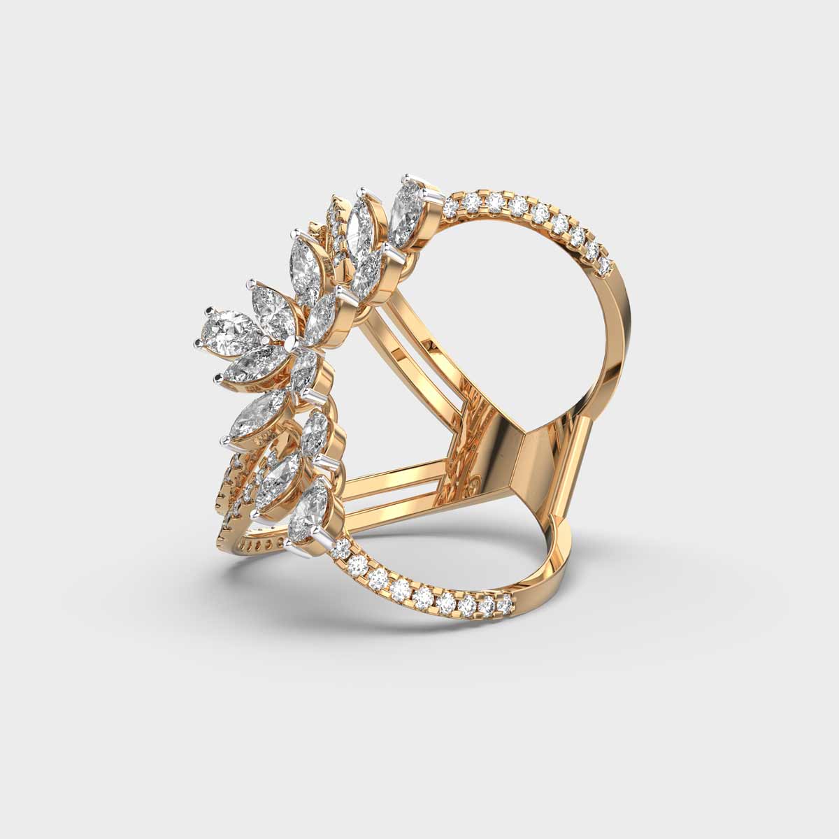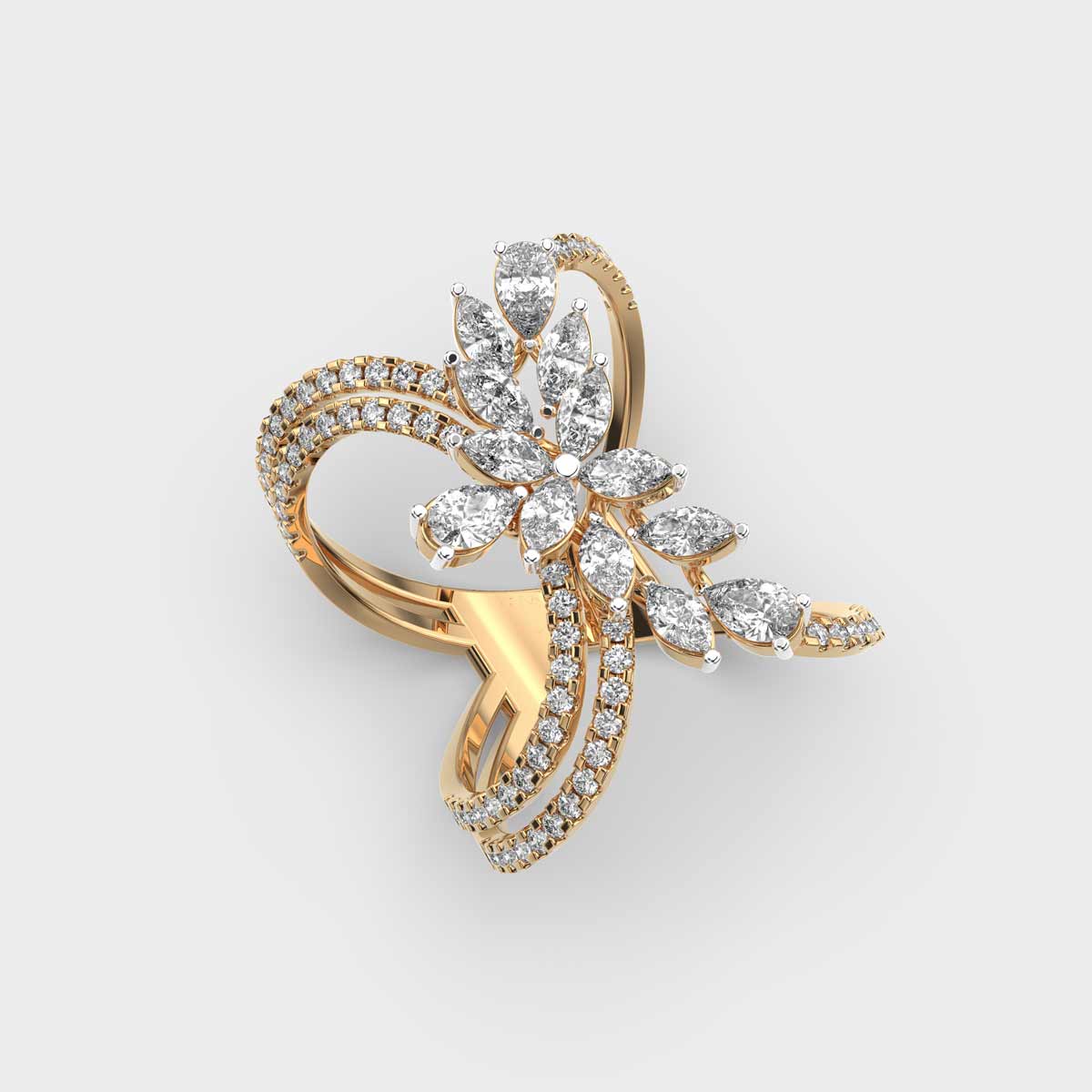 The Petal Crossover Diamond Cocktail Ring is where fluid elegance meets contemporary charm. Designed with overlapping curves that resemble delicate petals in motion, this piece blends marquise and pear-shaped diamonds in an abstract silhouette that feels both romantic and bold. Ideal for cocktail soirées or festive evenings, it carries the grace of floral design with the drama of fine diamond craftsmanship. Whether styled solo or layered with other rings, it brings a sculptural sparkle to every gesture.