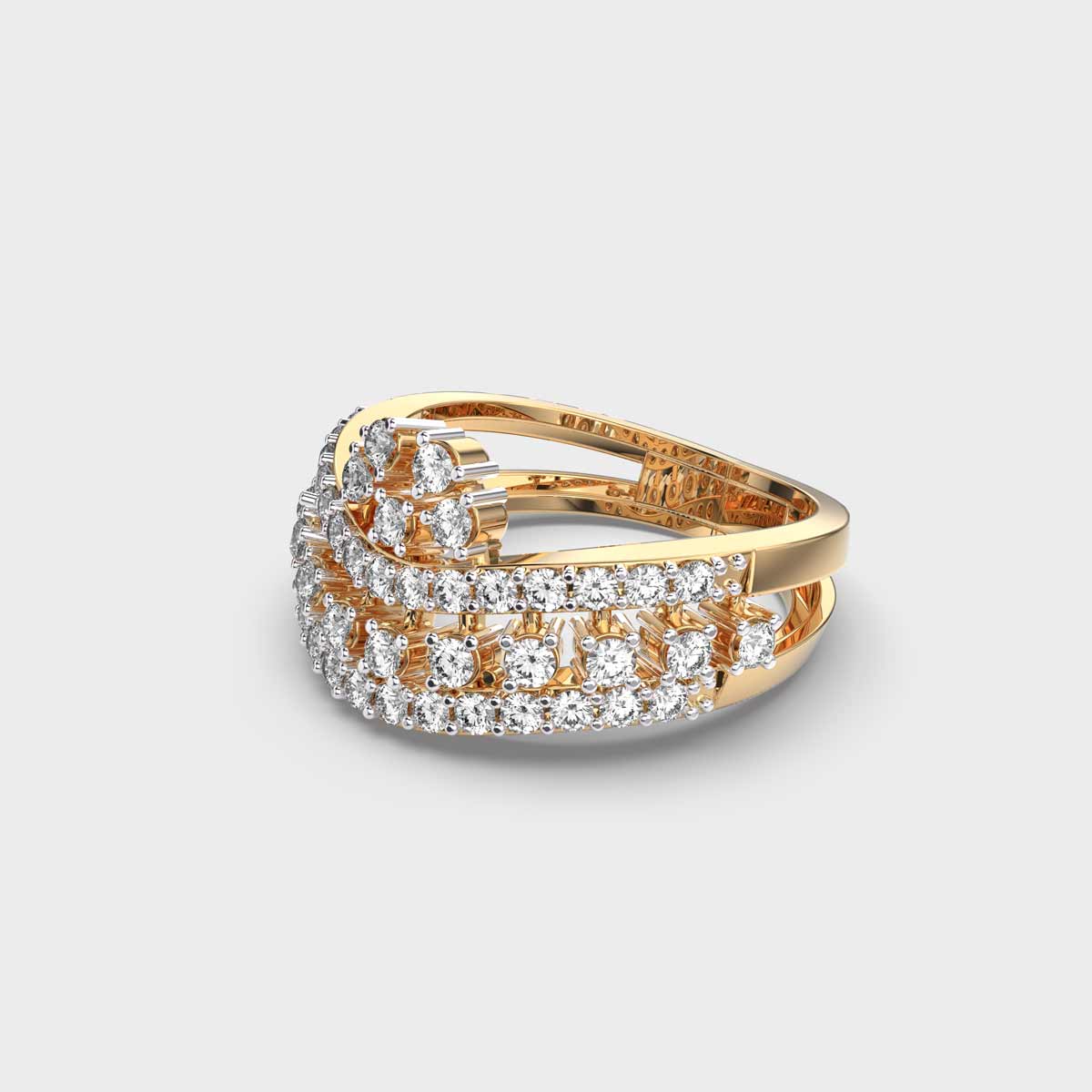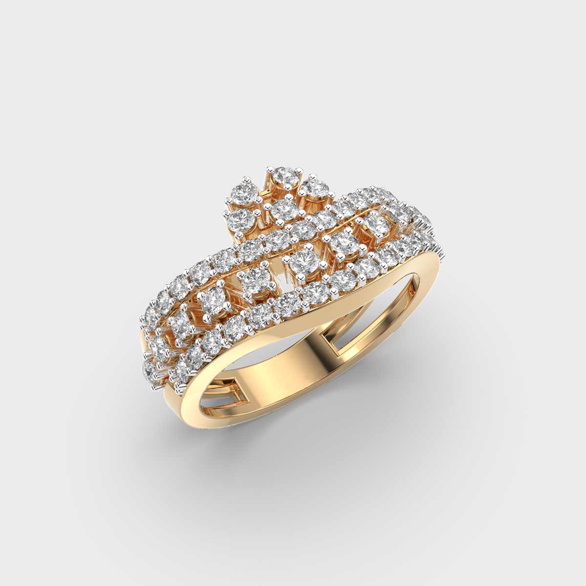 This luxurious ring features 47 round brilliant-cut diamonds, totalling 0.690 carats. Each diamond ranges from 0.01 to 0.07 carats, carefully arranged to create a crown-like silhouette that radiates elegance and power. All diamonds are graded GH colour and VS clarity, offering a consistent, captivating sparkle from every angle.