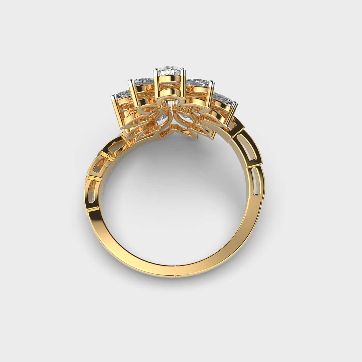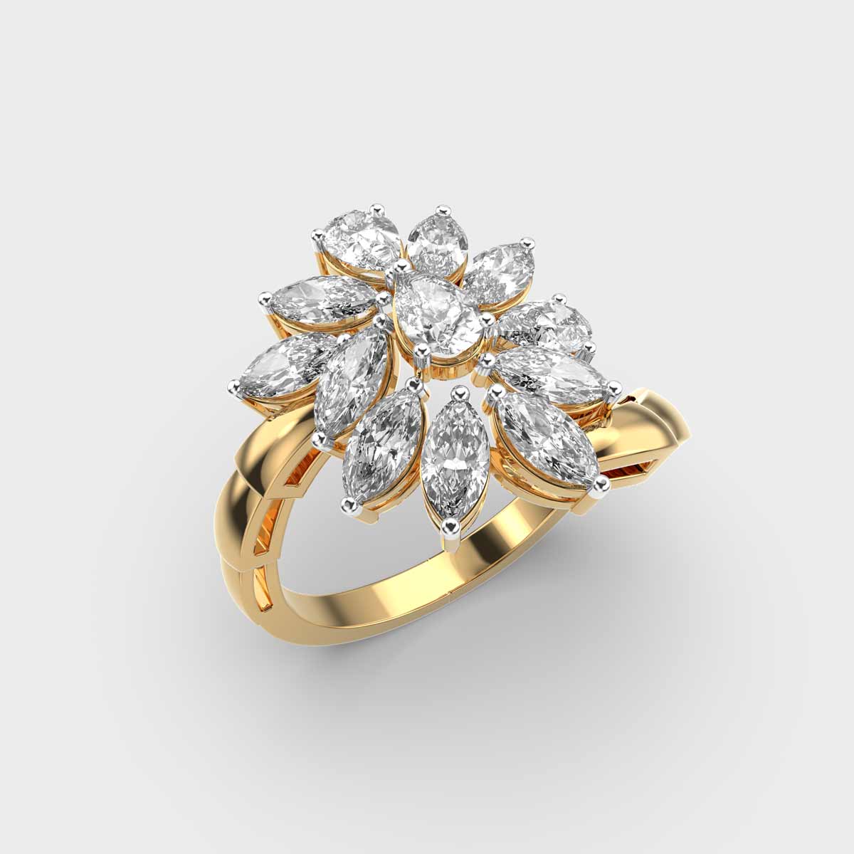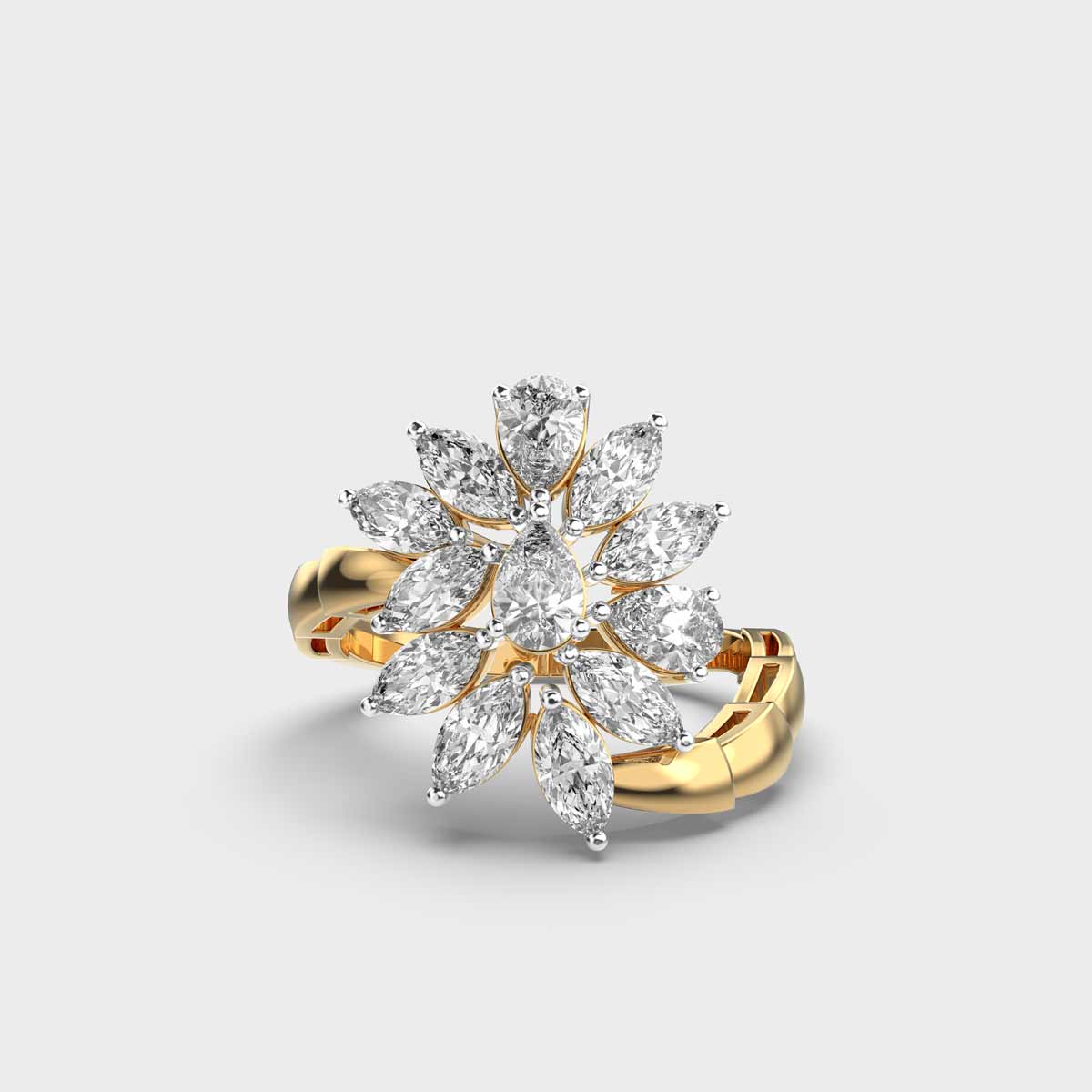 Echoing the grandeur of royal traditions, the Showstopper Marquise Diamond Cluster Ring is adorned with radiant diamonds that capture a regal charm. Its intricate design reflects timeless Indian artistry, making it a striking choice for festive celebrations or statement occasions. A jewel that embodies majesty and heritage, it stands as a true symbol of splendour.