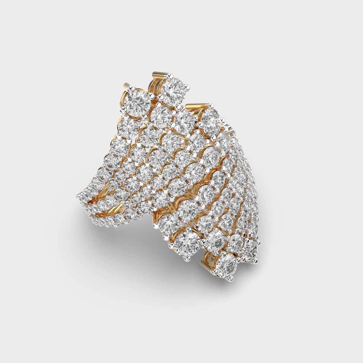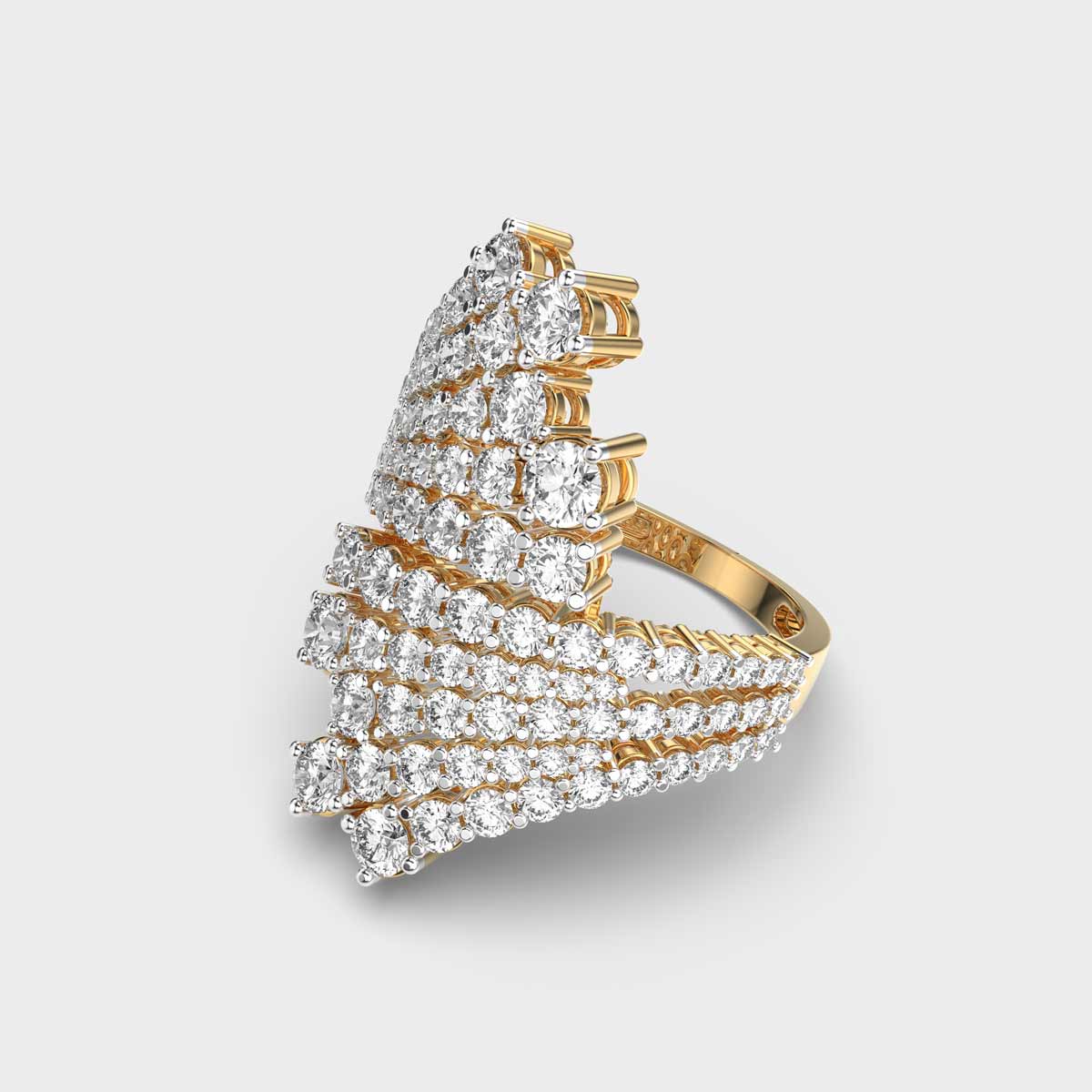 Defined by its sharp lines and radiant brilliance, the Starry Rays Cocktail Diamond Ring features clustered diamonds that capture light from every angle. Set on a sleek band, the design highlights the stone’s geometric beauty while maintaining a timeless appeal. Perfect for marking life’s milestones or adding refined sparkle to everyday style, it’s a versatile piece that blends modern charm with classic sophistication, a true symbol of infinite sparkle.
